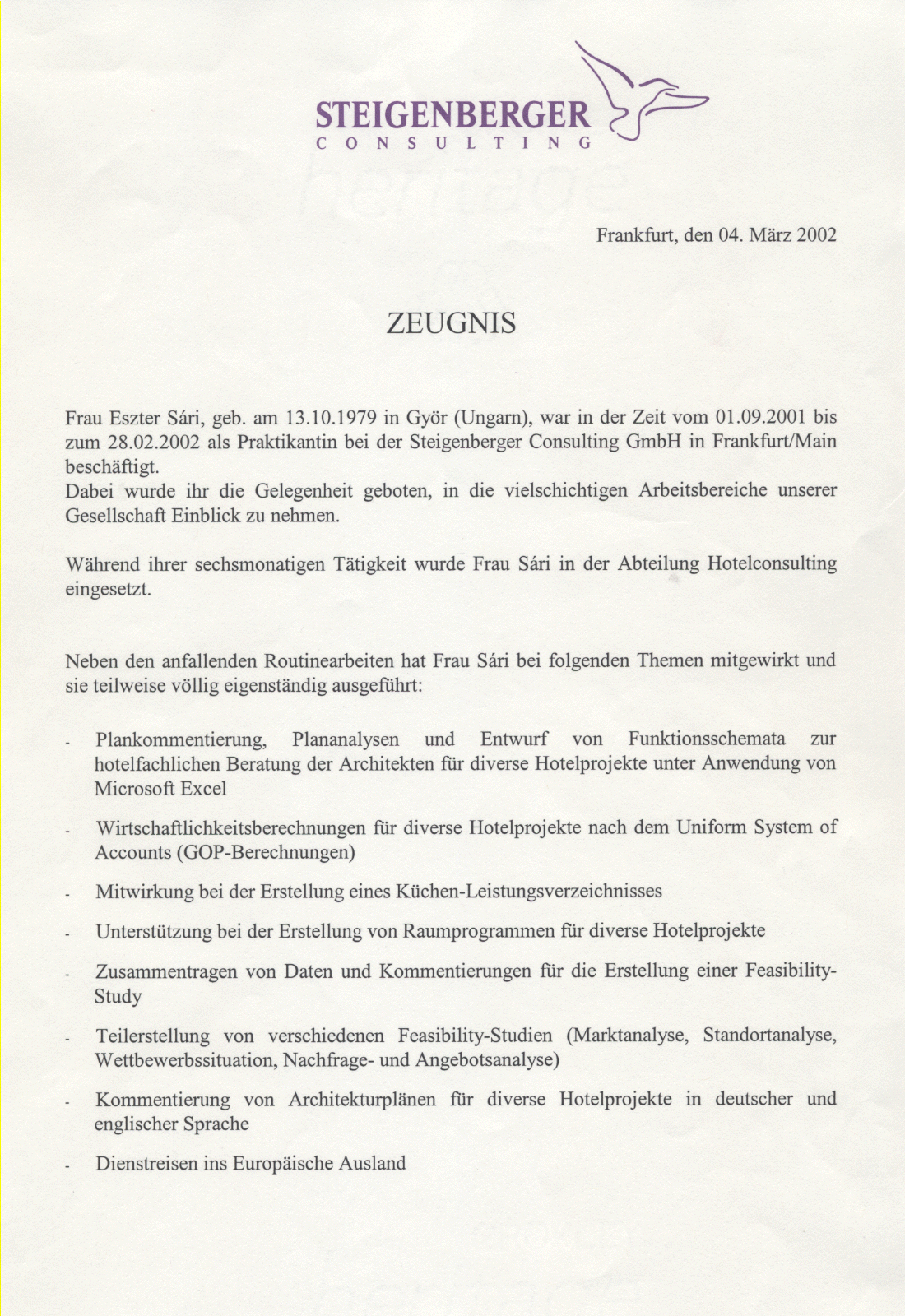 Praktikumszeugnis (Hilton Mainz)